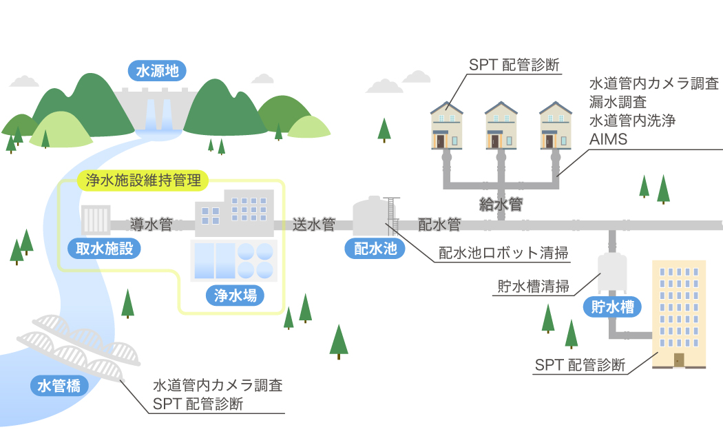効率的かつ効果的に水道の安定供給及び安全確保に貢献し、水の節約、環境にやさしい水道の総合メンテナンスサービスをご提供いたします。 配水池ロボット清掃 水道管内カメラ調査 水道管内洗浄 漏水調査 次世代型水道管路漏水情報管理システム(AIMS) 貯水槽清掃 SPT配管診断 浄水施設メンテナンス 関連協会リンク 日本水中ロボット調査清掃協会 全国水道管内カメラ調査協会 全国水道管洗浄技術協会 日本水道管路管理協会 群馬県貯水槽管理協同組合 日本建物配管調査診断協会